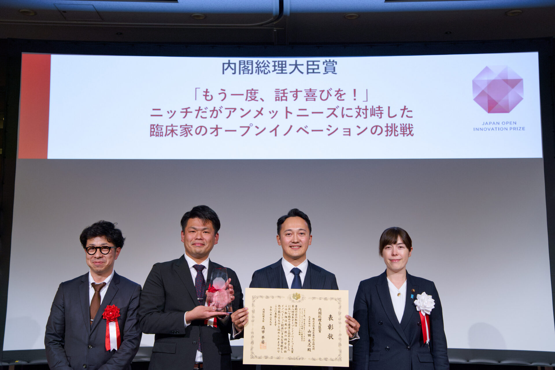 第8回日本オープンイノベーション大賞 表彰式(内閣府主催、2026年2月9日開催)において、マウスピース型人工喉頭「Voice Retriever®」の開発に関する取り組みが、最高賞である『内閣総理大臣賞』を受賞いたしました。